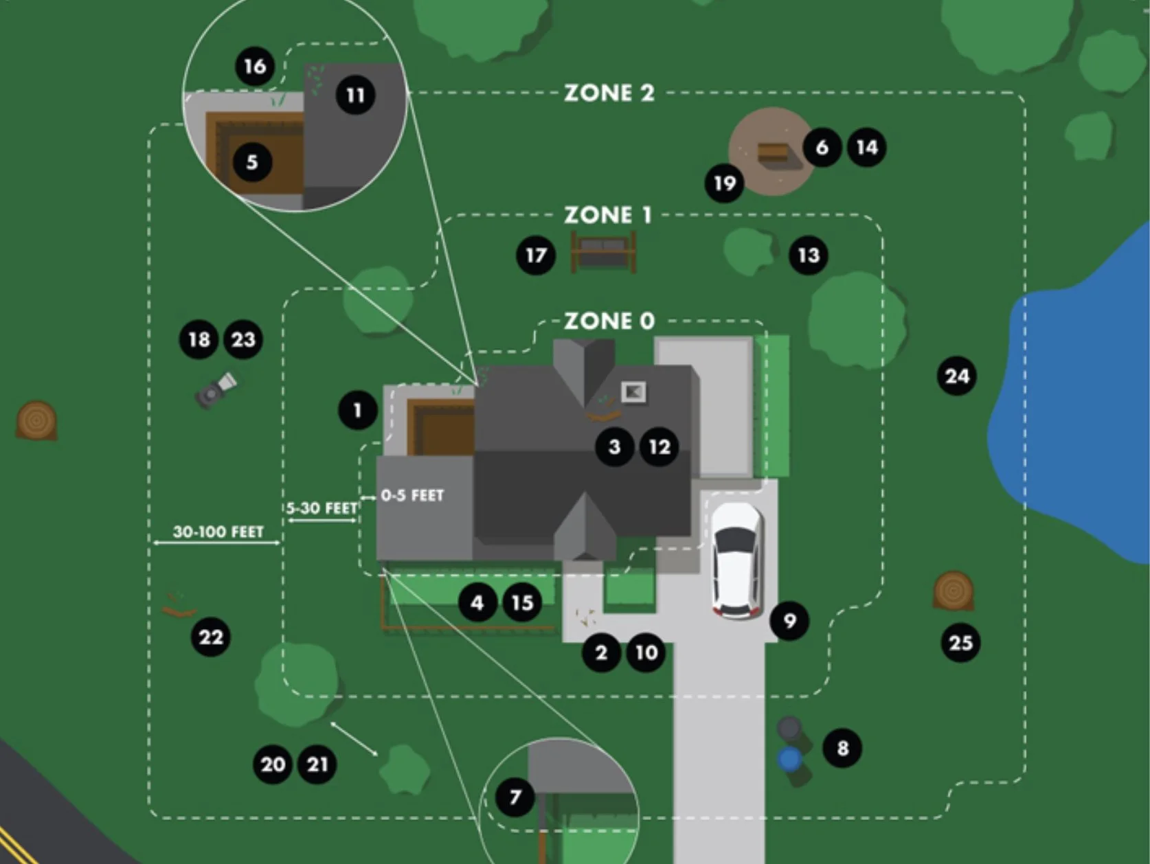 5-30 feet Lean, Clean & Green Zone. This zone begins five feet from your house and extends to 30 feet away.